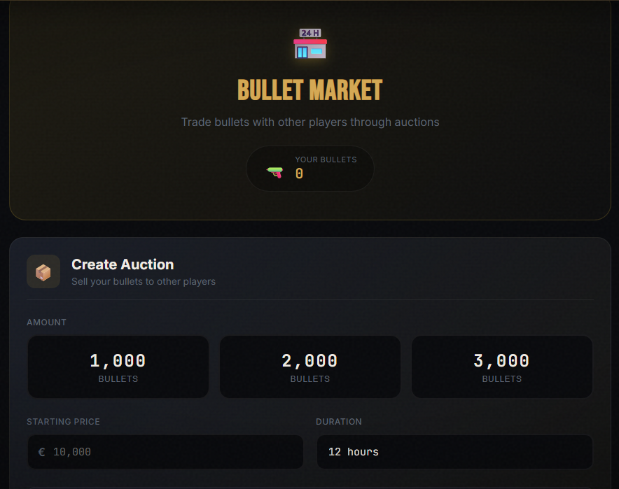 Buy and sell bullets through the auction system. Outbid other players to get the best deals.